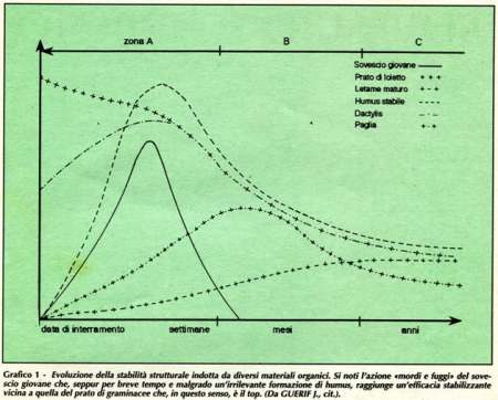 Come si vede dall'ultimo grafico l'azione di miglioramento della struttura del terreno e della sostanza organica nel breve periodo in caso di sovesci è quasi paragonabile a quella di altri sistemi di fertilizzazione organica delle colture, ma si perde velocemente nell'arco di pochi mesi non essendo paragonabile per produzione di umus stabile a quella del letame. E veniamo così alla seconda domanda: a quanto letame corrisponde un sovescio? Facciamo brevemente due conti: se consideriamo un contenuto medio del 5 ‰ di azoto nel letame avremo che, per avere una equivalenza di azoto nel terreno pari ad un sovescio di Veccia Velluatata ad ettaro (che apporta 219kg di N), dovremmo apportare ben 219 x 2 = 438 ql di letame. Con lo svantaggio che l'azoto disponibile dalla mineralizzazione del letame sarà diluito in molto più tempo ed andrà a rendersi disponibile in periodi, pensiamo alla vite, nei quali la disponibilità eccessiva di azoto potrebbe ridurre la qualità e provocare un allungamento del periodo di maturazione. Dunque il sovescio, come intelligente pratica agronomica capace di ridurre l'inquinamento, ottimizzare le risorse biologiche e fornire vitalità al terreno, sempre più in affanno per prodotti chimici ed eccessive lavorazioni. 4 febbraio 2008