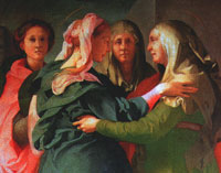 Il mistero non si svela subito, ci vuole un po' di attenzione, ma poi è chiaro, le immagini sullo sfondo non sono che la visione speculare, frontale, di Maria e di Elisabetta. Le stesse acconciature, la stessa differenza di età e le somiglianze nei lineamenti, solo i colori delle vesti della seconda Maria sono diversi, ma, a ben vedere, complementari a quelli della Maria in primo piano. Ora capisci perché ti guardano così intensamente, è un invito, o forse un ordine, a partecipare al loro incontro, uno sguardo che ti proietta nella scena.