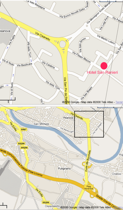 L'Hotel dista pochi metri dal nuovo ospedale di Cisanello. Dalla Strada Grande Comunicazione FI-PI-LI uscire a Pisa nord-est e dirigersi verso nord, lungo Via Giovanni Gronchi. Alla prima rotonda uscire subito a destra e, dopo pochi metri, imboccare la piccola rotonda seguente e di nuovo uscirne subito, a destra. Alla fine della strada, di fronte al complesso ospedaliero di Cisanello, dirigersi a destra e proseguire per 100 metri.