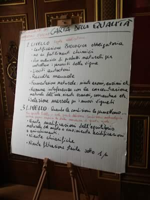I vignaioli, una dozzina, erano gli aderenti a Renaissance des Appellations Italia, associazione che si rifà ai dettami biodinamici e all'esempio di Nicolas Joly, al momento presieduta da Stefano Bellotti di Cascina degli Ulivi. Tra loro molte le aziende Toscane, per ragioni di vicinanza territoriale, e molte, e diverse, le storie e le filosofie. Se infatti tutti i presenti aderivano senza dubbio al manifesto dell'associazione, vergato a mano su un cartello all'ingresso della sala, diverso è il grado di coinvolgimento teorico con la dottrina steineriana (alla base dell'agricoltura biodinamica). Da un'adesione pragmatica, di chi vede i risultati della cura del vigneto e del vino nel proprio prodotto, e non si addentra più di tanto in giustificazioni teoretiche a chi, viceversa, parte da una adesione ideologica e la riversa nelle pratiche di vigna e cantina. Se alcune aziende sono arrivate alla naturalità sull'onda crescente di questi ultimi anni, altre hanno alle spalle un cammino pluridecennale di spontanea ricerca, iniziato magari senza neppure sapere che da qualche altra parte del mondo c'era chi seguiva la stessa strada a partire da elucubrazioni teoriche ben più corpose.
