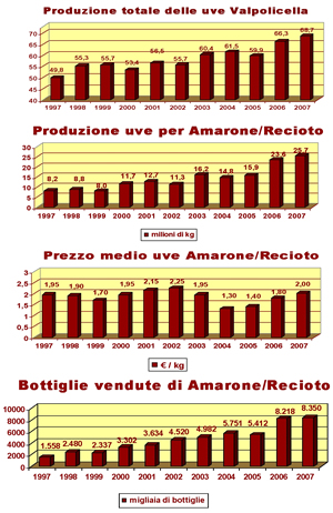 Ma forse le notazioni più interessanti riguardano l'"economia" dell'Amarone: 5839 ettari iscritti all'albo del Valpolicella, 2470 aziende, delle quali 1226 producono uva per l'Amarone; 390 fruttai per l'appassimento dell'uva (cinquanta meno dell'anno scorso) e 90 milioni di euro il valore totale delle uve prodotte. Il fatturato della DOC Valpolicella si attesta sui 220 milioni di euro "in uscita" che il mercato porta a 500-600 milioni di euro: è il fatturato più alto per una DOC italiana.