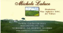 punta dell'azienda. Anche per l'azienda il cammino è ancora lungo, in particolare per cercare eleganza e equilibrio laddove si esprimono ancora irruenza e potenza. Ma che tutto questo non vada ad intaccare quello che questi vini sanno esprimere: una piena corrispondenza col territorio e con il vitigno, orgogliosi delle loro origini e rispettosi della propria tradizione. 21 aprile 2004 Degustazioni effettuate presso lo stand dell'azienda al Vinitaly il 3/4/2004 Azienda Agricola Michele Laluce