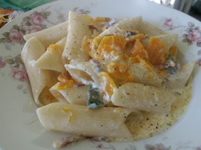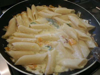 4 salti in padella? I rigatoni alla zucca che vi proponiamo sono quasi altrettanto veloci nell'esecuzione, ma assai meno costosi, più leggeri e di assoluta digeribilità: nessun soffritto, niente aglio, niente cipolla né formaggio! Quanto al gusto ... giudicate voi.