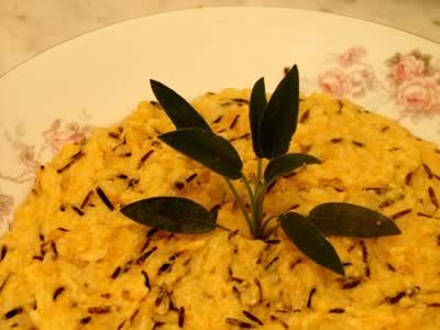Nella nostra ricetta abbiamo utilizzato riso selvaggio, anche per creare un contrasto cromatico con la crema gialla, ma questo dona al piatto note aromatiche abbastanza decise che si possono evitare, ottenendo un sapore più tradizionale, con l'utilizzo di riso dal sapore più neutro (arborio, baldo, carnaroli). Lasciate cuocere mescolando di tanto in tanto, non c'è infatti gran pericolo che il riso si attacchi, vista la quantità di liquido. Solo alla fine della cottura (circa 25 minuti per il riso selvaggio che abbiamo utilizzato), mescolate con cura, e infine aggiustate di sale e mantecate con formaggio grana e burro in cui avrete fatto soffriggere leggermente alcune foglie di salvia (poi tolte). Portate in tavola ben caldo e contrastate la dolcezza della zucca con una bella macinata di pepe nero.