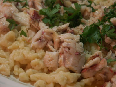 Ingredienti per 4 persone. Per gli spätzli: 250 grammi di farina 0, un decilitro di acqua, sale, un cucchiaio di olio extravergine, due uova intere. Per il sugo: 500 grammi di triglie, due spicchi di aglio, 4 cucchiai di olio extravergine d'oliva, prezzemolo, sale, peperoncino, mezzo bicchiere di vino bianco. 15 settembre 2007 |