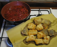 In un tegame di coccio mettete a soffriggere in olio d'oliva un pesto di aglio, rosmarino e peperoncino. Appena l'aglio è dorato, aggiungete un cucchiaio d'aceto e fate sfumare.
