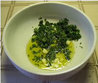 Fate un battuto con gli aromi e uno spicchio d'aglio (se volete toglierlo prima di servire, aggiungetelo intero, magari aumentando la dose), tritandoli non troppo finemente con la mezzaluna o con un coltello (il mixer tende a bruciare gli odori) e mettete il tutto nella zuppiera con cui servirete la pasta. Condite con due cucchiai d'olio d'oliva, sale e, se piace, peperoncino in polvere.