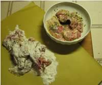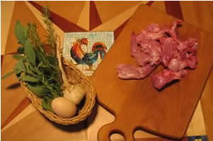 Fate a pezzi un coniglio genuino, utilizzando magari il solo quarto anteriore, più saporito e meno adatto alla cottura arrosto. Fate un battuto di aglio, rosmarino e salvia (se ne avete non guasteranno nepitella e peporino) e infarinate i pezzi del coniglio con farina bianca.