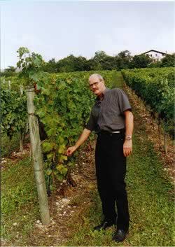 Il Teroldego Rotaliano DOC che degustiamo insieme non mi convince molto in bocca, presentandosi un pò aggressivo, pur avendo un bel colore rubino scuro intenso con riflessi violacei, e un naso con profumi intensi fruttati. Ne vengono prodotte 50.000 bottiglie a un prezzo intorno ai 9 euro, gradazione alcolica 13%. Questo vino, annata 2001, viene fatto in acciaio per il 90% e in barrique per il 10%. La scheda tecnica riporta anche il portainnesto, lo Schwarzmann. Per quanto riguarda il già citato Pini compariamo le annate 1998 e 1999, e il risultato è piuttosto interessante, poichè scopro che il vino che tanto mi era piaciuto a Milano, il 1998, è stato battuto dall’annata successiva, più rotonda, più persistente, più accattivante. Certo, entrambi hanno caratteristiche di prim’ordine quali un naso molto ampio di profumi, frutta rossa, menta, cioccolato, leggera tostatura e leggerissima speziatura, e una bocca che ha buona morbidezza, piacevolezza e un ottimo equilibrio garantito dall’acidità, facendone un vino molto piacevole da bere. L’annata 1999 dice 13% per un prezzo intorno ai 20 euro, molto ben spesi. Anche Zeni fa un novello a base Teroldego: lui dice di fare il novello più buono d’Italia, mi riservo di verificare questa sua affermazione. Per lui il novello è importante, "è una marcia in più per recuperare valore e immagine". Zeni mi porta poi a vedere questo impianto di Teroldego allevato a spalliera: la vista sulla vallata è incantevole, la vigna è in pendenza vertiginosa, ci sono i grappoli sulle piante, sembra tutto a posto, vedremo. La giornata è ancora lunga: rintraccio Pierfranco Giovannini presso uno degli stand allestiti per la festa del vino di Mezzocorona, lo stand 11, "quello della pallavolo" mi dice per telefono. Nel frattempo faccio in tempo ad assistere a parte dell’apertura della festa, con discorso del sindaco, banda e via discorrendo. Lo stand è allestito in un magnifico cortile interno di una casa del centro storico del paese, ci sono panche e tavoloni, e si preannuncia una serata per lui impegnativa, in cui si mangerà e si berrà in pace con il mondo. Giovannini ha addosso un grembiule, lavorerà allo stand tutta la sera, mi dice subito, dedicandomi il tempo che può prima che gli avventori arrivino. Lui è il presidente della squadra di pallavolo femminile, l’associazione pallavolo "Il basilisco", ancora la leggenda del drago quindi.
